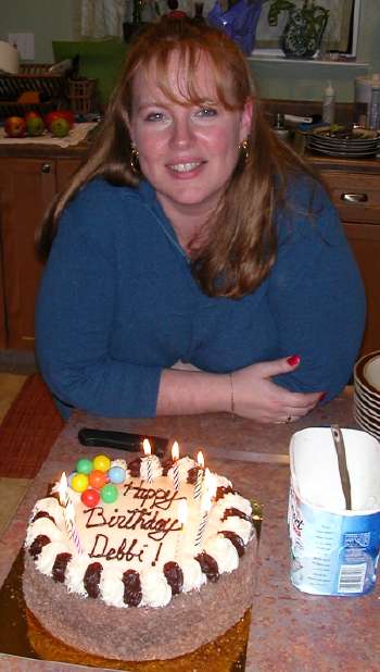 The party went really well. Debbi was totally surprised (she had a couple of hints but didn't regard them very strongly), dinner was good, and the cake was quite good! (Okay, that wasn't really a surprise.) After dinner we actually did play a game, a Cheapass Game called Give Me The Brain!, which is very silly. Debbi even won!