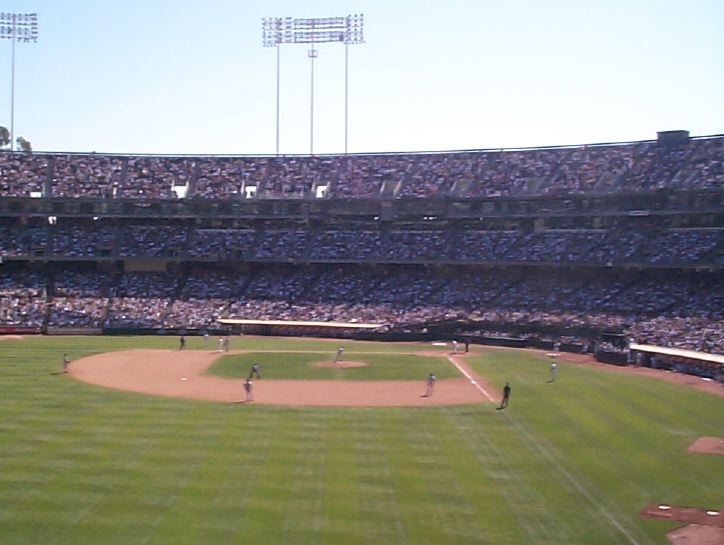 Two shots of the Oakland Coliseum from our seats. I think right fielder Matt Stairs is at bat with Jason Giambi on first base. |
